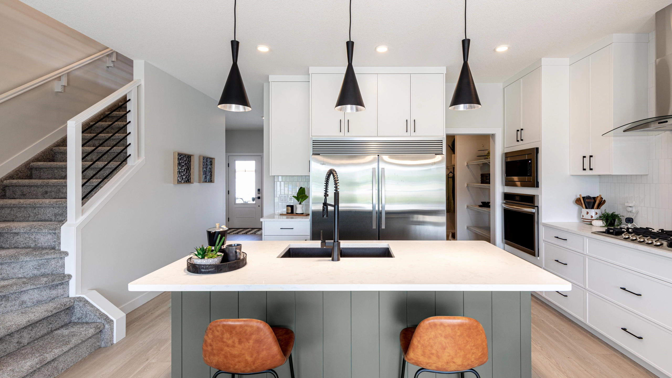 The Macan has a total living space of 1,872 sq.ft., with 3 bedrooms, 2.5 baths and a cozy bonus room retreat. Walking through the foyer to the kitchen there is an option to add a glass wall to the staircase to open the space as an added feature. This exclusive model includes executive chef’s appliances including a gas range, and double wide fridge. The view from the kitchen island is the living space with great room and nook at the back of the home. Enjoy the convenience of a walk-through pantry that leads to the mudroom and double car, attached garage. Up the stairs is the bonus room with the laundry room, including linen storage close by. There are 2 bedrooms as well as a master bedroom retreat complete with a walk in closet with a window for additional light and an ensuite that includes double sinks. Optional side entry.